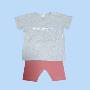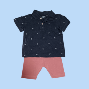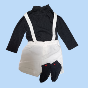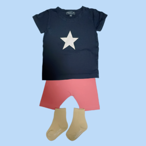 トップスはたまたまアニエスベーを使っていますが、黒いシンプルなデザインのTシャツであればブランドは何でもOK。西松屋やバースデイ、UNIQLOでも十分揃います。