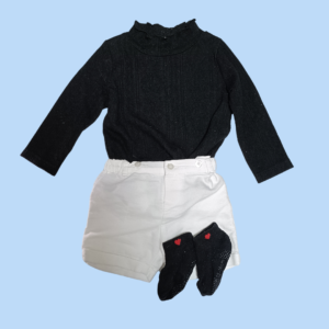 黒トップスは西松屋で、冬物売りつくしのタイミングで半額ほどで購入したものです(おそらく500円くらい?)。こういったシンプルなアイテムはセール時期を狙うとかなり手頃に手に入ります。